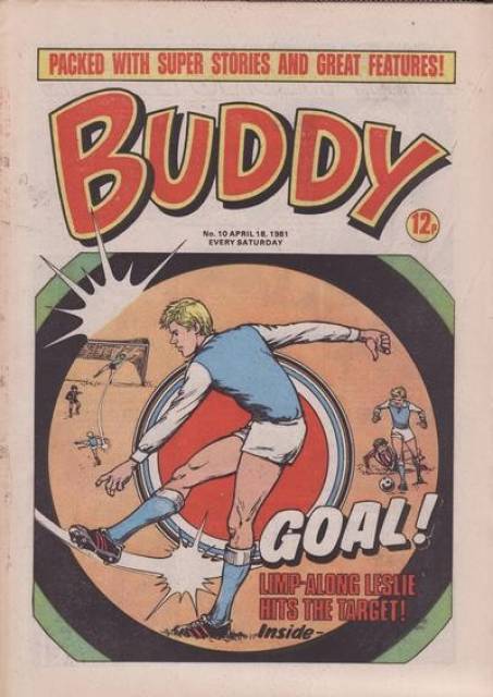 British adventure comic from 1980. Most of the first 97 issues have a "Buddy's Super Peronsality Serries" double centre page spread (two colour, red and black) with a comic book strip biography feature of TV personalities (Lewis Collins, Kenny Everett, etc), sports people (Pele, Ian Botham, etc) and pop stars (Cliff Richard, Ringo Star, David Bowie, etc).